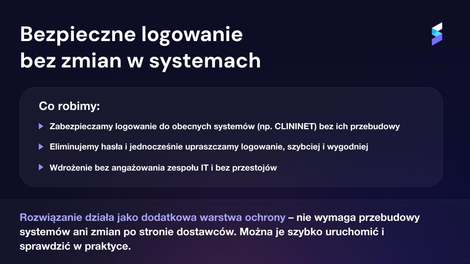 W praktyce oznacza to dodanie warstwy ochronnej, która kontroluje uwierzytelnianie niezależnie od tego, do jakiego systemu użytkownik się loguje. Systemy pozostają bez zmian, ale sposób dostępu do nich zostaje wzmocniony.
