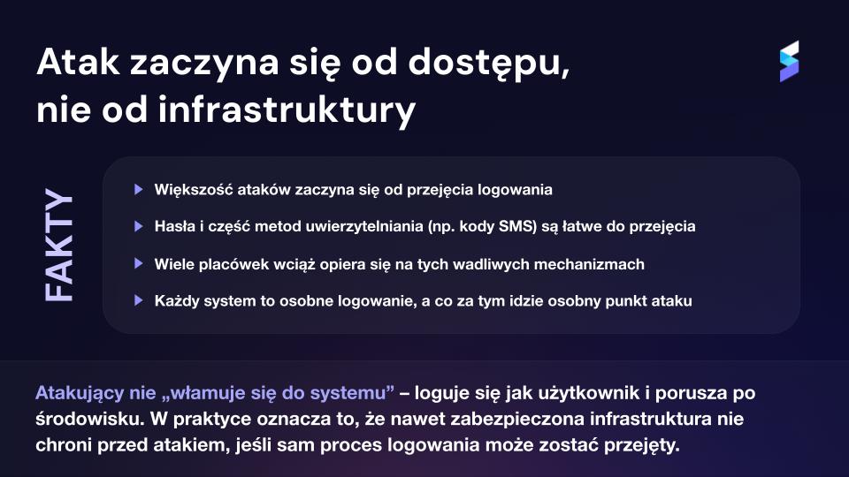 Nawet jeśli część środowiska jest dobrze chroniona, wystarczy jeden słabszy element. Atakujący nie szuka najlepiej zabezpieczonego systemu, szuka najłatwiejszego sposobu wejścia, czyli logowania.