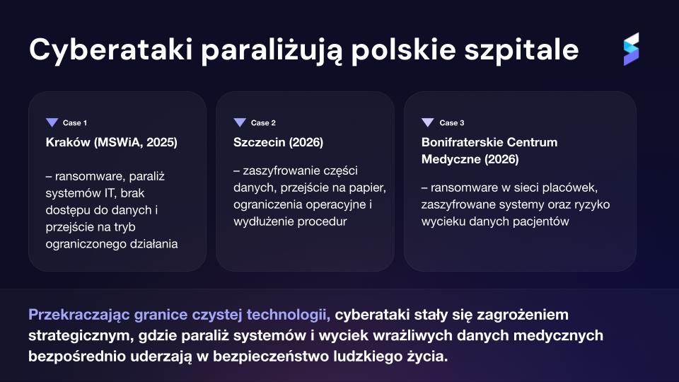 To właśnie łączy ostatnie incydenty w Polsce, niezależnie od technologii czy wielkości placówki, efekt jest ten sam: brak dostępu do systemów i konieczność przejścia na tryb awaryjny. W Krakowie oznaczało to utratę dostępu do danych, w Szczecinie powrót do dokumentacji papierowej, a w przypadku sieci Bonifratrów także ryzyko wycieku danych pacjentów.